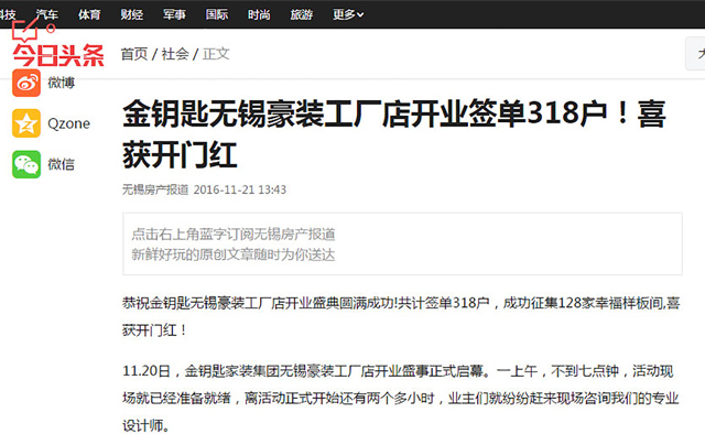 今日頭條媒體報道無錫金鑰匙豪裝工廠店裝飾公司盛大開業(yè)